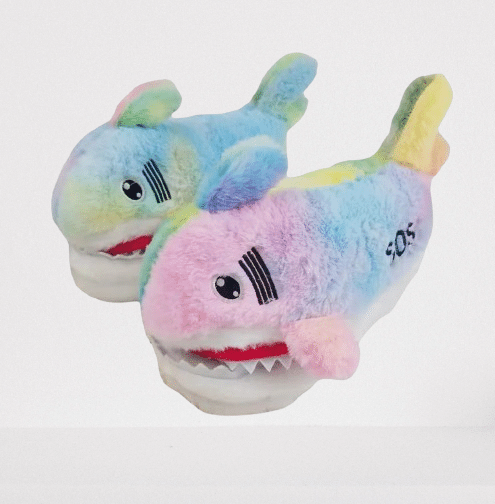La peluche multicolore du chausson requin arc en ciel est douce et chaude dès qu’on glisse le pied dedans.