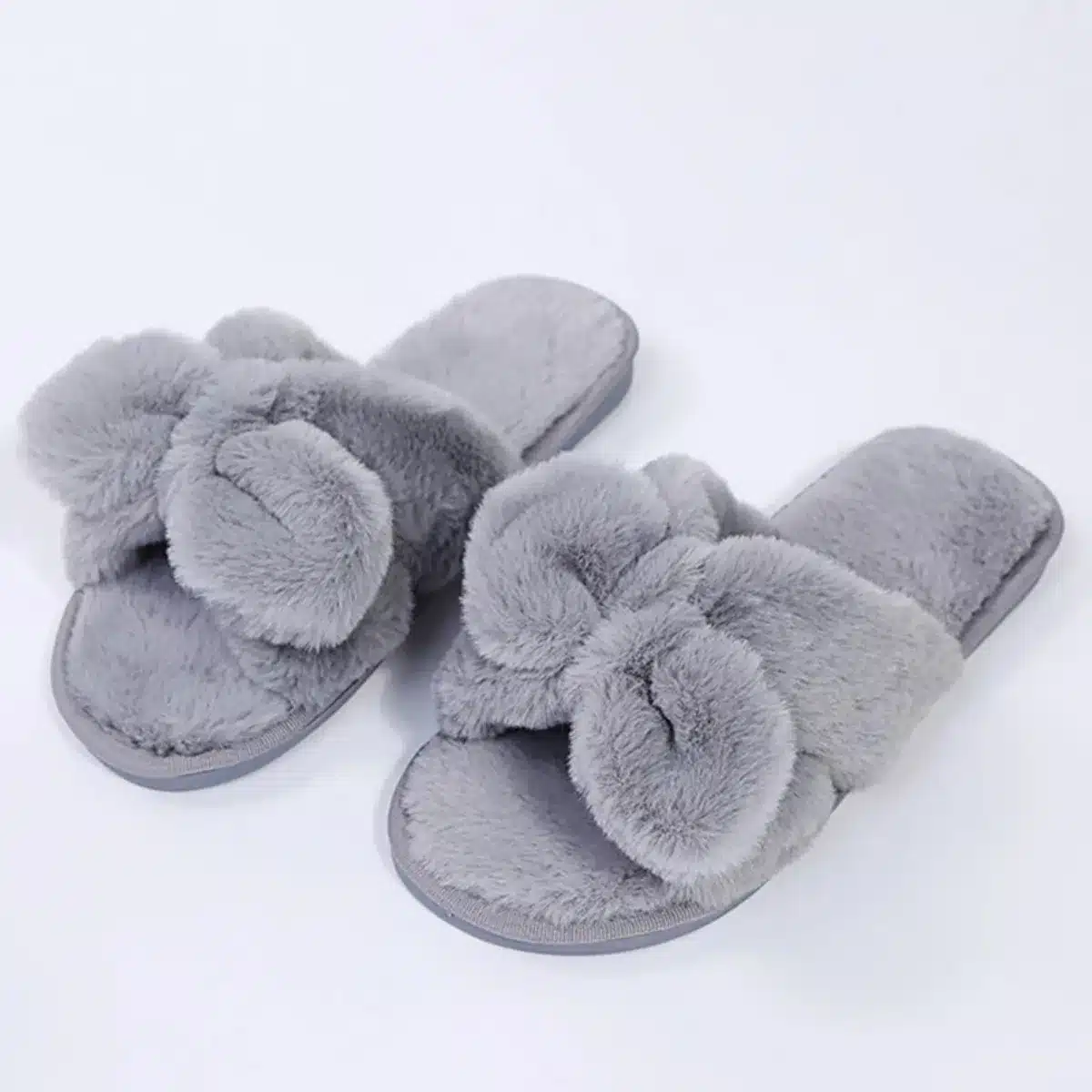 Ces pantoufles ouvertes gros nœud sont en coton et fausse fourrure, ce qui leur donne une douceur incroyable au toucher.