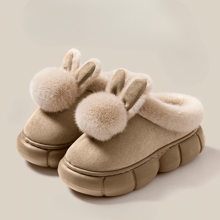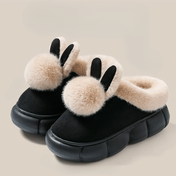 Le dessus en daim doux est décoré de deux oreilles et d’un pompon en fausse fourrure qui rappellent une tête de lapin, pour un look mignon et original.