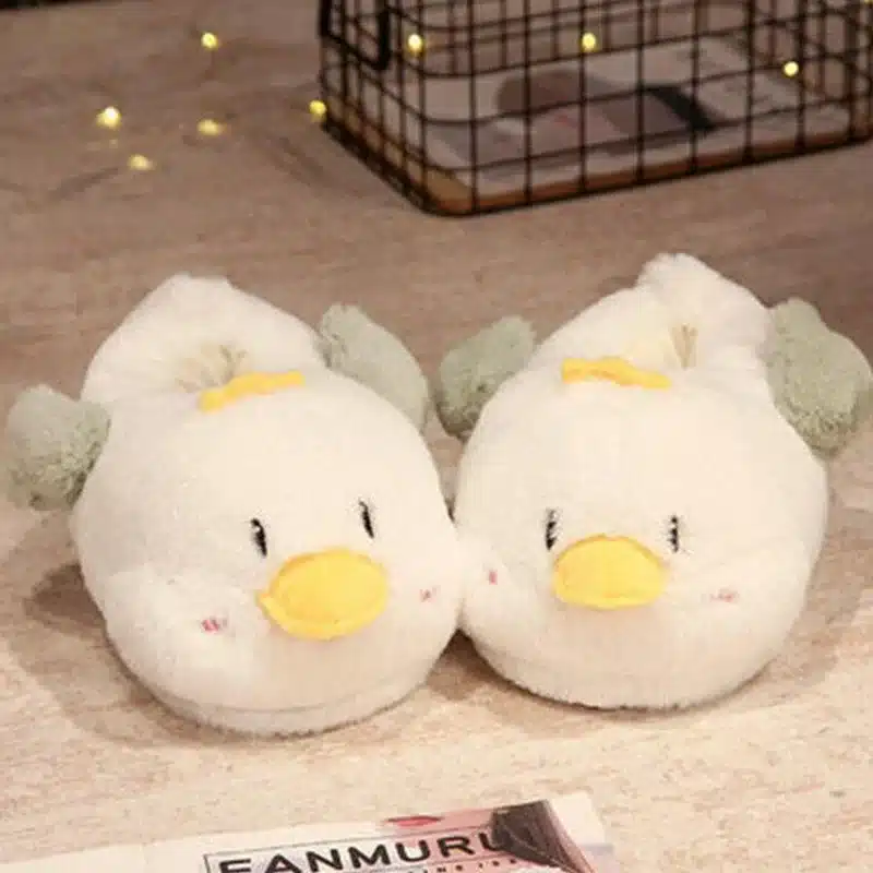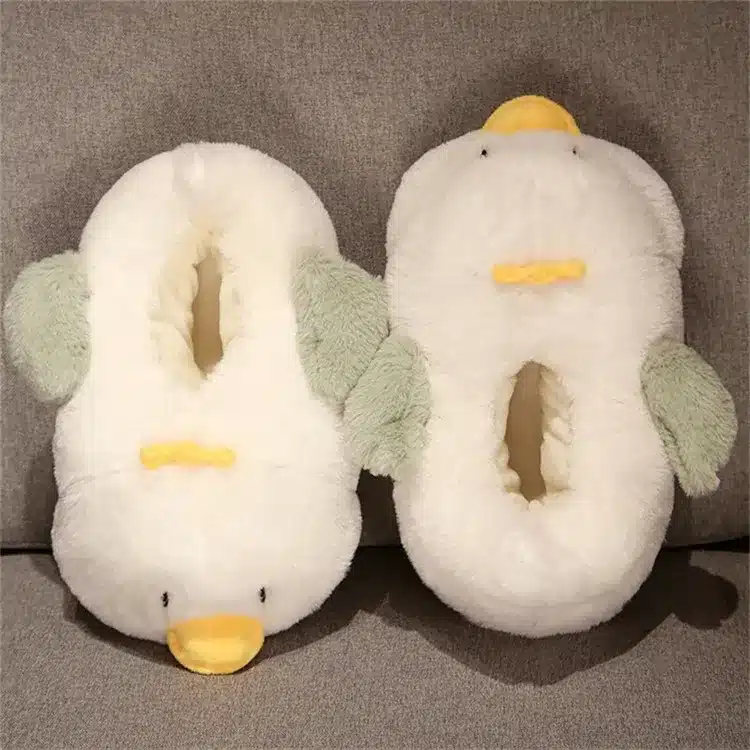 Bec jaune et ailes vertes en relief qui donnent un style amusant et unique à ces pantoufles canard femme.