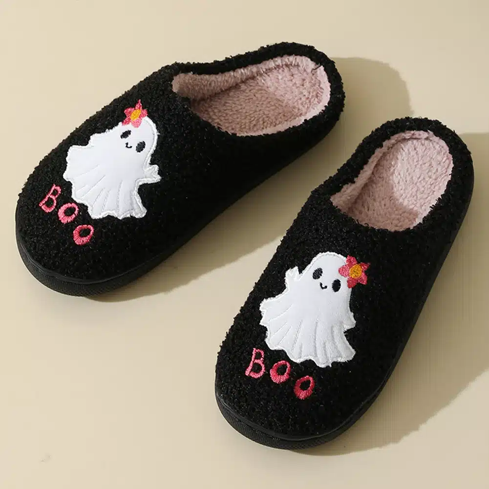 Les pantoufles fantôme kawaii séduisent avec leur petit fantôme blanc orné d’une fleur orange et du mot “Boo” brodé en rose, pour un style mignon et plein de bonne humeur.
