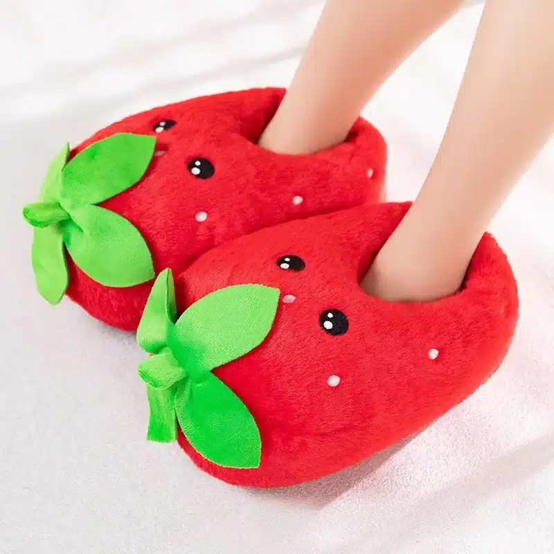 Les pantoufles fruits prennent la forme d’un ananas ou d’une fraise géante avec grains brodés, visage kawaii et grandes feuilles 3D à l’avant pour un style fun qui fait sourire.