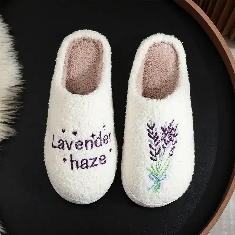 Les pantoufles lavande ont l’intérieur garni d’une doublure moelleuse beige qui garde les pieds bien au chaud tout en offrant un confort enveloppant dès que vous les enfilez.