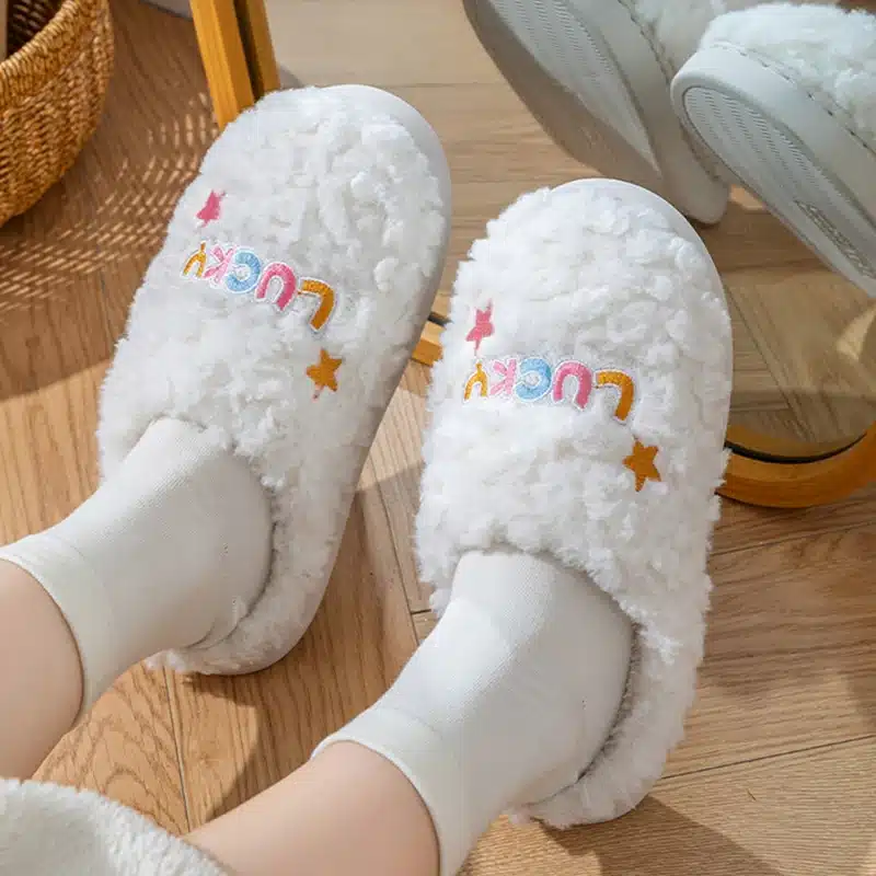La matière bouclette effet mouton des pantoufles Lucky garde les pieds bien au chaud tout en offrant une douceur moelleuse dès qu’on les enfile.