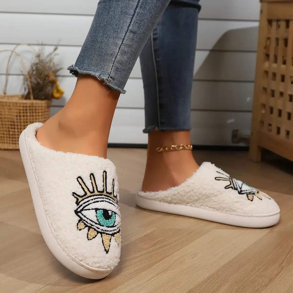 Les pantoufles œil séduisent par leur design original et moderne avec un grand œil brodé entouré de cils dorés.